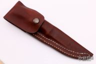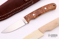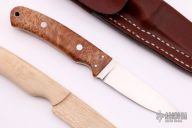 This Hunter by Paul S Goertz features a hand rub satin finished blade with .135" blade stock and .984" blade depth, full tapered tang construction. The handle has burl wood scales. Comes with a brown leather sheath. Excellent condition.