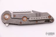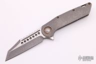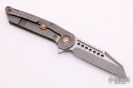 This Warhound flipper by Marfione Custom Knives features a two-tone apocalyptic finished blade with fullers and flipper. The handle has an apocalyptic finished titanium frame and tip up clip with copper hardware, pivot collars and backspacer. Nice detent, lockup and blade seating. Dated 09/2018 and s/n 009. Comes with original box, zippered case and COA. Excellent condition.