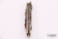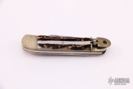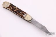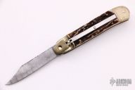 This Lever Lock Automatic by Hubertus Knives features a Damascus clip point blade with fileworked spine. The handle is comprised of nickel silver double bolsters and lever with stag scales over brass liners and steel backspacer. Has some patina and light scratches, otherwise excellent condition.