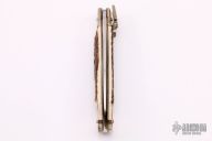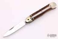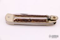 This leverlock auto by Hubertus features a spear point blade, nickel silver double bolsters, stag scales, and brass liners and pins. Opens with a nice snap. Very fast opening. Has some patina and light scratches, otherwise excellent condition.