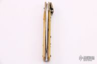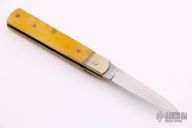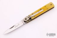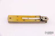 This leverlock auto by Hubertus features a spear point blade, nickel silver bolsters, yellow bone scales, and brass liners and pins. Opens with a nice snap. Very fast opening. Has some patina and light scratches, otherwise excellent condition.