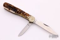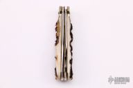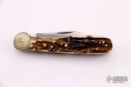 This knife by Hubertus is unique, it features two satin finished blades. The larger blade is an auto and is fired by pressing down on the back of the small blade. The handle has nickel silver bolsters, stag scales, brass liners and steel springs. Has some patina and light scratches, otherwise excellent condition.