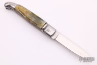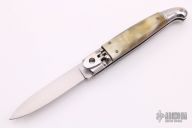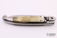 This leverlock auto features a satin finished blade. The handle has stainless steel bolsters and butt, honey horn scales and stainless steel liners. Strong opening. Has a few light scratches, otherwise good condition.