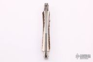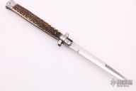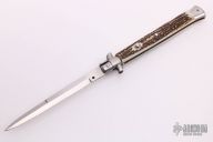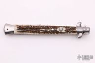 This swivel bolster auto by Italy features a polished blade with a false top edge. The handle has stainless steel bolsters and butt, stag scales and brass liners. Strong opening. Has safety. Has some scratches, otherwise good condition.