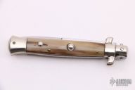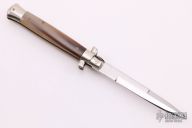 This Picklock Auto features a mirror finish spear point blade. The handle consists of nickel silver bolsters and honey horn scales over brass liners and stainless steel backspacer. Steel push button. Has a few light scratches and some oxidation on the spine of handle, otherwise good condition.