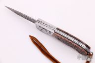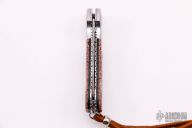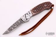 This Bolster Release Auto by Mike Whiskers Allen features a Nichols Damascus blade with fileworked spine. The handle has engraved steel dovetailed bolsters, armadillo scales over micarta scales, fileworked stainless steel liners and backspacer. "Whiskers 08-08" inside backspacer. Nice action, lockup and blade seating. Excellent condition.