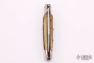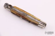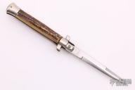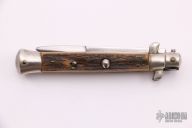 This pick-lock auto by Coricama features a spear point blade with a false top edge. Nickle silver guard and rear bolster and stag scales. D-stamped brass liners. Nice function, strong firing. Has some scratches, otherwise good condition for its age. Thought to be from the 1950s.