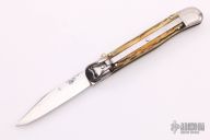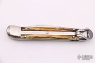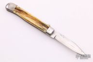 This Vintage Leverlock Auto by JA Henckels features a polished clip point blade. The handle has threaded nickel silver bolsters, stag scales, brass liners and steel spring. Has some scratches and patina, otherwise good condition for its age.