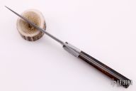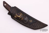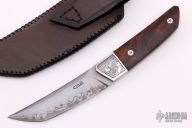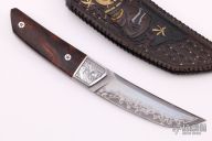 This Tanto EDC by CAS Knives features a San Mai blade with false top edge, .160" blade stock and 1.125" blade depth, full tapered tang construction. The handle has laser engraved stainless steel bolsters, ironwood scales with laser engraved stainless steel pins. Comes with a hand tooled and painted leather sheath and a leather zippered case. New from maker.