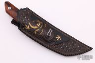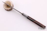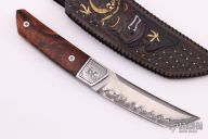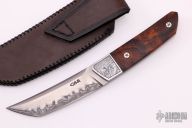 This Tanto EDC by CAS Knives features a San Mai blade with false top edge, .169" blade stock and 1.134" blade depth, full tapered tang construction. The handle has laser engraved stainless steel bolsters, ironwood scales with laser engraved stainless steel pins. Comes with a hand tooled and painted leather sheath and a leather zippered case. New from maker.