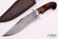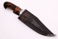 Another absolutely stunning piece from the Sobral brothers! This fighter features a massive recurve blade that has been crafted from Damascus, the top edge is not sharpened, .271" blade stock and 2.212" blade depth, hidden tang construction. The guard is stainless steel with a beautiful stag grip that has been masterfully shaped/contoured to fit the hand, brown canvas/natural canvas/nickel silver/ironwood spacer pattern. This piece comes in an equally impressive, hand tooled, black/brown leather sheath and a leather zippered case. New from maker.