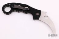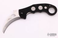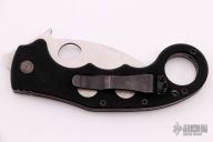 This Emerson Super Karambit has a stonewashed chisel ground hawk bill blade with notched thumb rest and wave feature. Handle is comprised of black G10 scales, titanium liners with and has a lanyard hole at the butt. Also has a black anodized stainless steel clip positioned for right or left-handed tip up carry. Serial number 1708. Excellent condition. Comes with original box and papers.