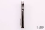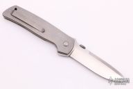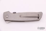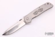 This ATCF Flipper is #42 of 75 commemorating Bob Terzuola's 75th Birthday, it features a spear point stonewashed blade with false top edge, thumbdisc, notched thumbrest and flipper. The handle has a stonewashed titanium frame with a single titanium liner, satin titanium backspacer with a raw diamond inset (i think that is what it is), tip up titanium clip with hidden screws. Comes with a zippered case. New from maker.