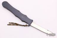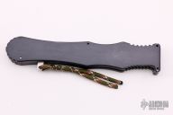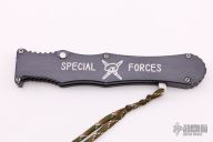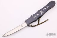 This Mayhem OTF by Rob Dalton features a satin finished upswept blade. The handle is black anodized aluminum with charging tab. "Special Forces" on the handle. Has some minor wear, otherwise excellent condition.