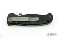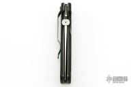 This linerlock by Crawford Knives features a satin finished blade with false top edge, notched thumbrest and a thumbdisc. The handle has black linen micarta scales, bead blasted titanium liners, stainless steel backspacer, tip down bead blasted stainless steel clip. Has some scuffs, otherwise excellent condition. Comes with a zippered case.
