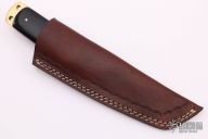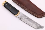 This Fixed Blade by Nikolaos Palamianakis features a 450 layer Damascus tanto blade with false top edge, .164" blade stock and 1.448" blade depth, full tang construction. The handle consists of Aries horn scales over bronze liners. Comes with a brown leather sheath New from maker.