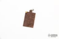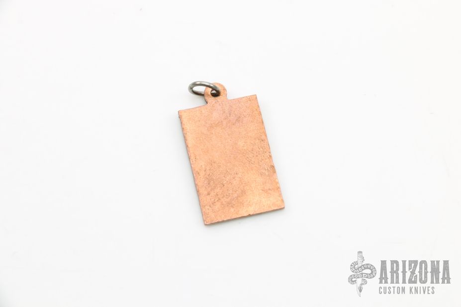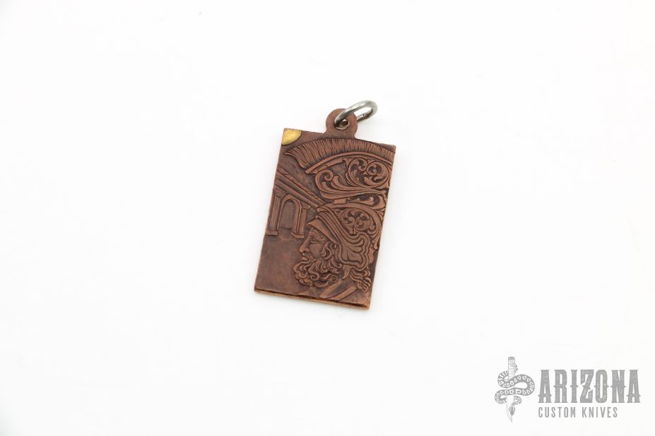 This handmade pure copper pendant features a relief engraving Centurion, with an elaborate ornamental helmet, standing by some classic Roman architecture. A 24k gold inlaid sun lends a beautiful accent and color variation to the scene. Includes a stainless steel chain and original box. New from maker.