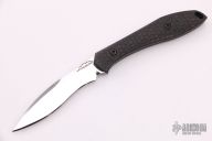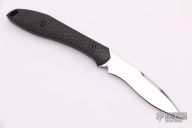 This Mongoose by Jerry Moen features a mirror polished recurve blade with notched thumbrest, .100" blade stock and .554" blade depth, mortise tang construction. The handle has a honeycomb milled carbon fiber grip with lanyard hole. Comes with a black leather sheath with pocket clip. New from Maker.
