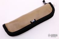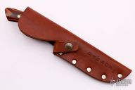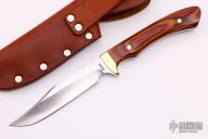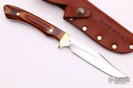 This Vintage Hunter by Barry Dawson features a satin finished clip point blade with a false top edge, .188" blade stock and .948" blade depth, full tang construction. The handle has brass bolsters, pakka wood scales with brass pins. Comes with a brown leather sheath with belt loop and a zippered case. Excellent condition. #86