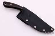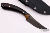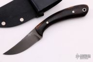 This knife by Lynn Dawson features a black blade with fileworked spine and notched thumbrest, .120" blade stock and .910" blade depth, full tang construction. The handle has wood scales with mosaic pins and lanyard hole. Comes with a black kydex sheath and zippered case. Excellent condition.