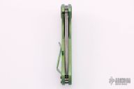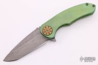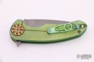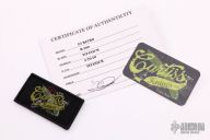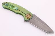 This F3 Retro by Curtiss Knives features a dark stonewashed blade with notched thumbrest and flipper. Anodized and tumbled titanium frame over standoffs with a matching titanium tip up clip. Smooth and fast opening using a Caged Bearing System. Nice blade seating, detent and lock up. Includes padded and zippered case and COA dated 5-20-20. Excellent condition.