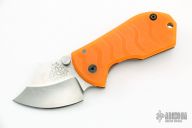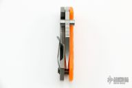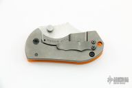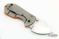 This custom frame lock folder features a stone wash finished blade with dual thumb studs. Orange G-10 and stonewashed titanium frame and pocket clip for tip up carry. Strong lock up, nice detent and blade seating is dead center. Nice little folder.Has a few light scuffs, otherwise excellent condition.