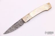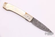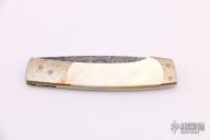 This Swift model self lock folding knife by Scott Sawby features a Chad Nichols Carbon Damascus blade with nail nick. The handle has a Mokume frame with gold lip pearl inlays, stainless steel backspacer. Nice lockup and blade seating. Comes with a zippered case. Excellent condition.