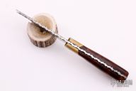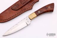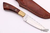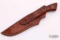 This hunter by Tom McLuin features a hand rub satin finished blade that has filework on spine and tang, .129" blade stock and 1.030" blade depth, full tang construction. The handle has brass dovetailed bolsters, ironwood scales with mosaic pins. The shape is very comfortable in the hand. Comes with a hand tooled brown leather sheath. "65 D2" on ricasso. Has been used and resharpened, has scuffs and scratches, fair condition.