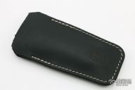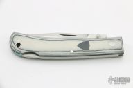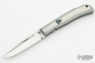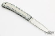 This OHLB by Jared Oeser features a hand rub satin finished blade with nail nick and single thumbstud. The handle has black/white carbo quartz scales over grey G-10 liners, satin finished stainless steel liners and spring, anodized titanium backspacer at the butt along with a lanyard hole. Comes with original box, COA dated 4-9-19, and black leather pocket sheath. Excellent condition.
