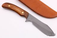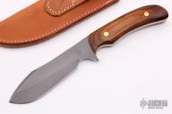 This Skinner by Barry Dawson features a bead blasted blade with a notched thumbrest, .193" blade stock and 1.347" blade depth, full tang construction. The handle has pakka wood scales with brass pins. Comes with a brown leather sheath with belt loop. Excellent condition. #66