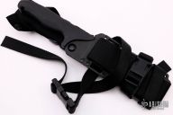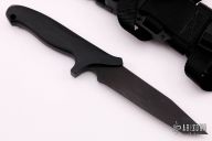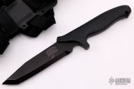 This Specwar Fixed Blade by Timberline Knives features a black-Ti Coated tanto chisel ground blade, @ 60 RC, 0.200" blade thickness and 1.393" blade depth. The handle is fiberglass reinforced nylon with a stainless steel butt plate for striking. Comes with a kydex sheath. This collaboration between Ernie Emerson and Vaughn Neeley won "American Made Knife of the Year" at the 1995 Blade Show. Has been sharpened, has some scuffs, otherwise good condition. Hard to find.