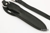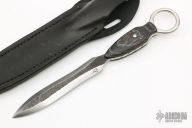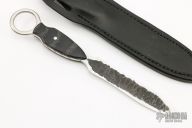 This Lucky Pigeon Sleeve Dagger by Paul Cooper features a hand forged chisel ground double-edged blade with hand rub satin finished bevels, the backside has a hammer forged fuller, .166" blade stock and .829" blade depth, hidden/mortise tang construction. The handle has ebonized oak scales with silver grain fill, fileworked tang and ring at the butt. Comes with a black leather sheath with arm strap. New from maker.