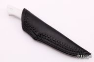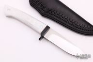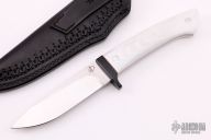 This Drop Point Hunter by Denis Mura features a satin finished drop point blade with .202" blade stock and 1.153" blade depth, full tapered tang construction. The handle has a black G-10 guard and white G-10 scales with red spacers and liners and stainless steel pins. Comes with a hand tooled black leather sheath by Kiara and a COA. New from maker.