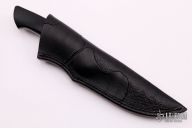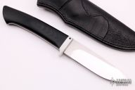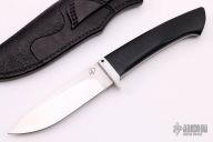This Drop Point Hunter by Denis Mura features a satin finished drop point blade with .195" blade stock and 1.171" blade depth, full tapered tang construction. The handle has a white G-10 guard and black  G-10 scales with black spacers and pins. Comes with a hand tooled black leather sheath by Kiara and a COA. New from maker.