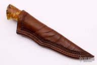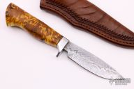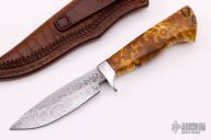 This Skinner by Denis Mura features a Fogonero Forge Mosaic Damascus blade with .225" blade stock and 1.111" blade depth, hidden tang construction. The handle has a stainless steel guard, stabilized Beech Burl wood grip and a brown spacer. Comes with a hand tooled brown leather sheath by Kiara. Comes with COA. New from maker.