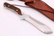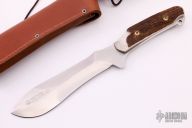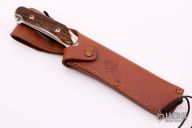 This New Hunter by Puma features a satin finished blade with false top edge and notched thumbrest, .157" blade stock and 1.492" blade depth, full tang construction. The handle has stag scales and a lanyard hole at the butt. Comes with brown leather sheath, original box and papers. Excellent condition.