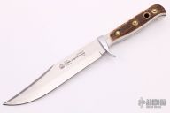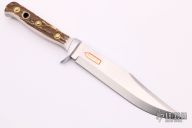 This Original Bowie by Puma features a satin finished blade with false top edge, .155" blade stock and 1.213" blade depth, full tang construction. The handle has an aluminum guard, stag scales and a lanyard hole at the butt. Comes with original box. Excellent condition.