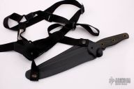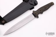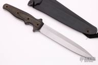 This knife by Tom Maringer features a dagger shaped blade with a sharpened top edge, .213" blade stock and 1.206" blade depth, full tang construction. The handle has green/black linen micarta scales with hollow pins. Comes with a kydex sheath with shoulder rig. Dated 1989 and #459 on the blade. Has some scuffs and scratches, has some light staining, otherwise good condition.