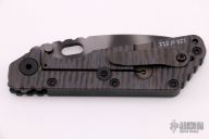 This SMF by Strider Knives features a tiger striped blade and textured black G-10 and flamed titanium handle and matching tip up titanium clip. Notches on thumbrest, rear of handle, and early lockup. Includes Hinderer "Lock Bar Stabilizer" for maximum reverse lock retention. New condition. Comes with original nylon case, patch, and COA.