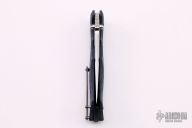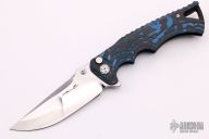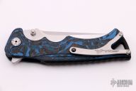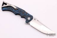 This Tighe Fighter Flipper by Brian Tighe features a polished and tumble finished multi-ground San Mai blade with notched thumbrest, S90V core with CPM154CM cladding. The handle has milled fat carbon scales, black G-10 backspacer and a tip up titanium clip with ceramic ball, lanyard hole at the butt. Comes with nylon zippered case. Nice action, lockup and blade seating. New from maker.