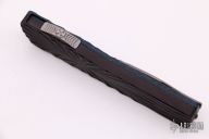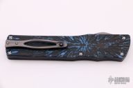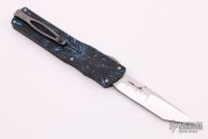This Twist Tighe OTF by Brian Tighe features a mirror finished tanto blade with textured flats. The handle has a milled and DLC coated titanium front, fat carbon back, tip up titanium clip with ruby ball insert, has ruby ball insert in the butt as a glass breaker, has a carbon fiber thumbslide. Comes with a zippered case. New from maker.