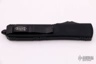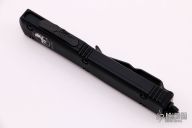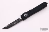 This Ultratech OTF automatic by Microtech features a T/E black tanto blade. Black aluminum contoured frame with all black hardware. Dated 09/2018. Excellent condition. Tip down carry with glass breaker.