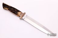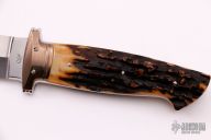 This Fighter by Fabrizio Silvestrelli features a drop point hand rubbed satin finish blade with false top edge, .231" blade stock and 1.241" blade depth, full tapered tang construction. The handle is comprised of bronzed and dovetailed Damascus bolsters, incredible stag scales, fluted guard under the bolsters, the tang and scales have been rounded and Heirloom fit. Extremely visually pleasing. Includes a zippered case. Excellent+ condition. A beautiful piece.