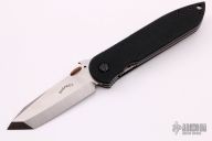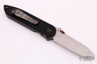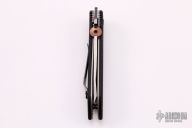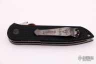 This Suspect 6 by Ernie Emerson features a chisel ground tanto blade with stonewashed flats, large copper thumbdisc, wave feature and notched thumbrest. Rides on bearings, nice detent, lockup and blade seating. The handle has black G-10 scales, tumbled titanium liners, tip up Steel Flame titanium clip reading "USN Suspect". Comes with an additional black stainless steel clip reading "USN". Comes with original box and papers. New condition.