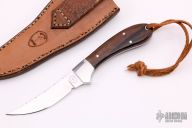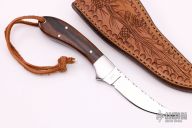 This skinner features an upswept mirror polished blade with a file worked spine and full tang construction.  .091" Blade Stock.  .764" Blade Depth.  The handle features polished steel bolsters complemented by wood scales and mosaic pins.  Includes a hand tooled brown leather sheath.  Light scuffs are visible on the bolsters otherwise the knife is in excellent condition.