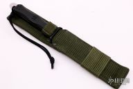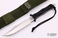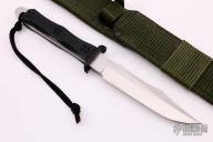The SOG Style Bowie by EK Knives has a satin finished SOG style bowie blade with .189" blade stock and 1.256" blade depth, full tang construction with black paper micarta scales. Tang extends 3/4" at the butt with a lanyard hole. Has a false top edge. Includes two layer heavy-duty Nylon sheath. Has some light scratches, otherwise excellent condition.