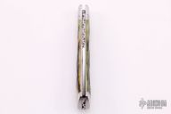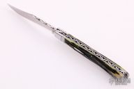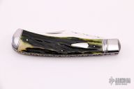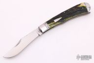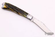This single blade trapper by Tobin Hill features a satin finished clip point blade with a single nail nick and a file worked spine.  The handle features fluted and threaded steel bolsters, dyed bone covers and a file worked backspring.  Includes a padded zippered case.  New From Maker.