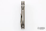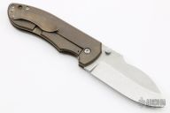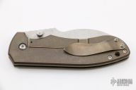 This V2 framelock folder features a stonewashed CPM-154 blade with dual thumbstuds and notched thumbramp. Handle scales are anodized and stonewashed titanium. Blade is centered when closed. Nice detent and nice solid lockup. Titanium clip is positioned for tip-up carry and is orange peel finished and anodized, lanyard hole at the base. Comes with original box and COA dated March 2014. New from maker. (New old stock)