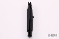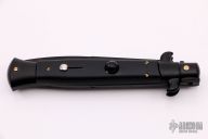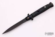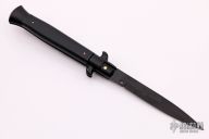 This Swivel Bolster Auto has a black stainless steel spear point blade. The handle is composed of a black steel front and rear bolsters, frame and liners all complemented by non-skid rubber scales. Excellent Condition.