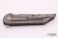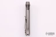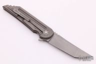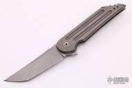 This UHEP frame-lock flipper by Jake Hoback has a stonewashed CPM20CV upswept/tanto blade, notched thumb-rest and flipper. Caged bearing pivot. "Ps23 Hoback" stamped around pivot. Handle is titanium with stonewashed finish, barrel spacers and matching tip up clip, reversible, left or right. This knife has an adjustable detent. Perfect detent, lockup, and blade seating, and flips like a boss. Knife is in excellent condition. Comes in original box. Has an upgraded pivot.